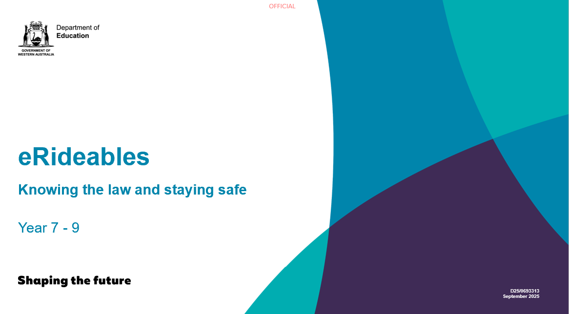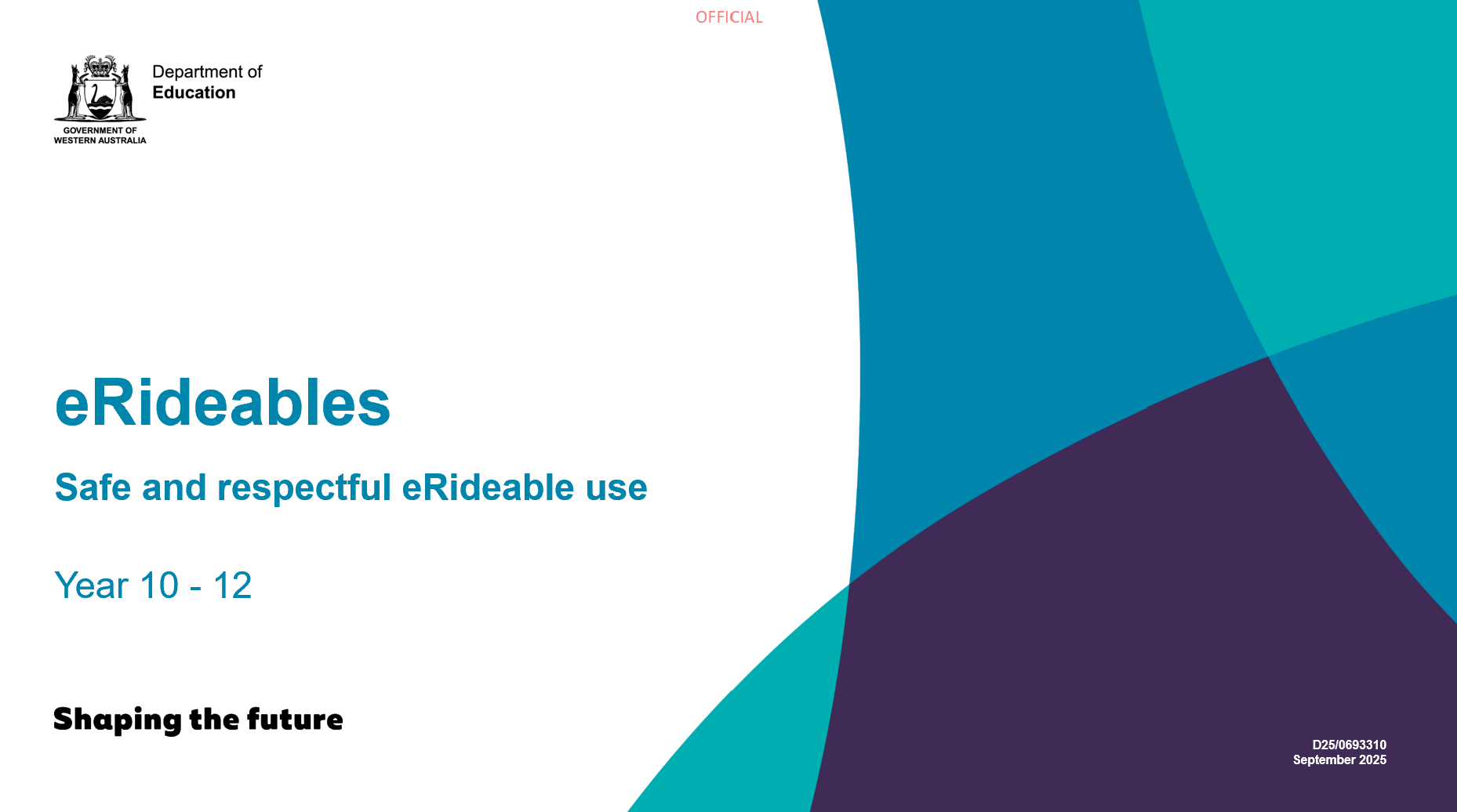 Additional supporting resources including parent/carer communication templates can be accessed through Ikon - Access information on the use of eRideables in schools. For teachers external to the Department of Education these are available on request by contacting the Road Safety and Drug Education branch.