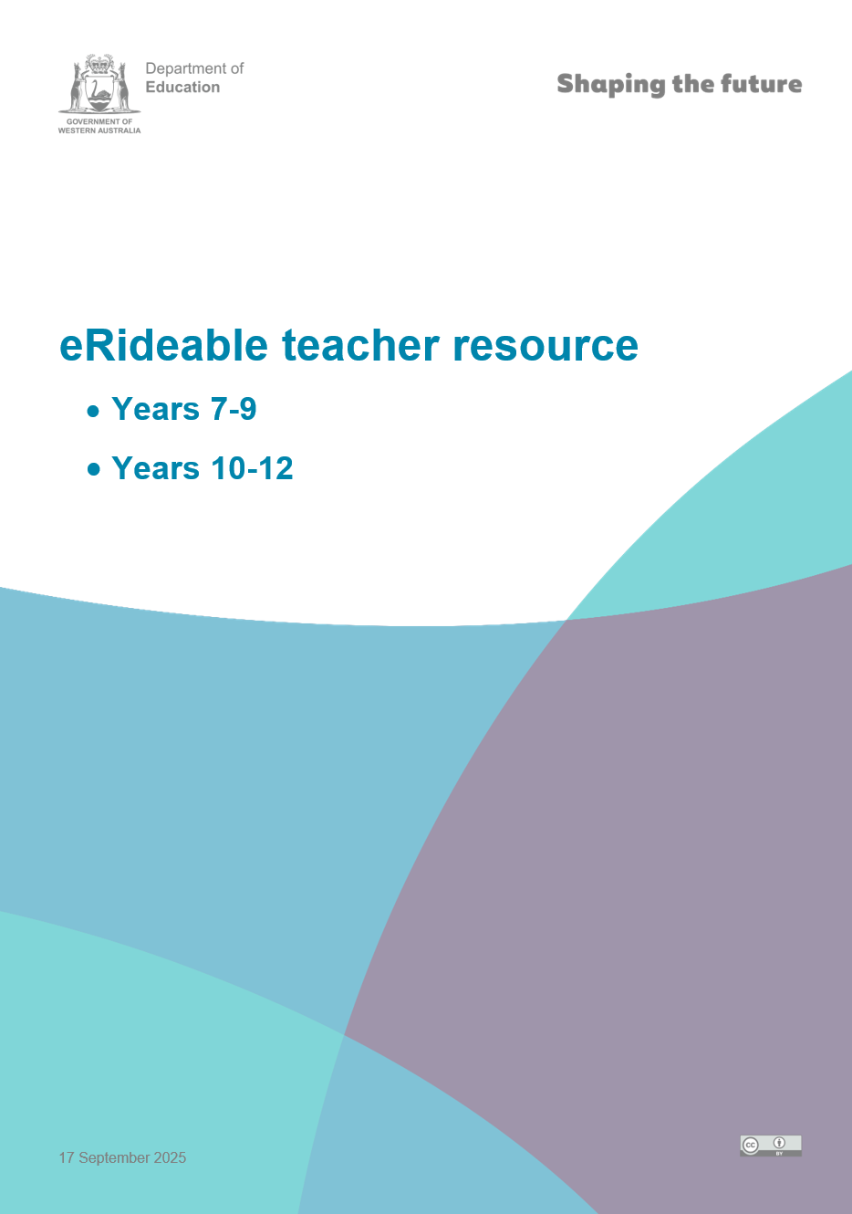 This resource is designed to raise awareness of the laws and risks of using eRideable devices, such as eScooters. The lessons have been separated into 2 year group categories to support students understanding of key concepts and laws related to the use of eRideables for their age group, noting: • Years 7–9: Students in these year groups (under 16 years of age) are not legally permitted to use eRideables. Therefore, the focus of these activities is on building awareness and understanding of the relevant laws. • Years 10–12: Students in these year groups are either legally allowed (over 16 years of age) or approaching the legal age, to use eRideables. In addition to key concepts and laws, these activities include content which emphasises ways to stay safe when using eRideables.