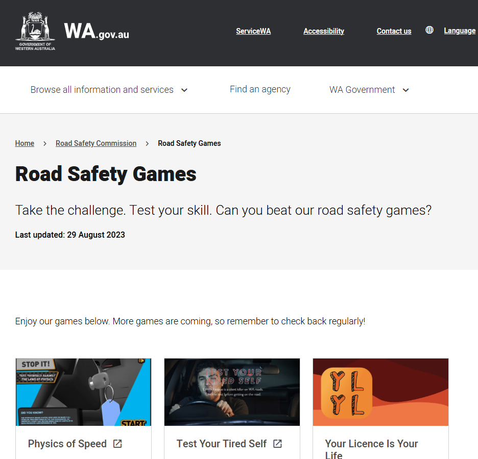 The Road Safety Commission’s website includes film clips and information about driver behaviours, vehicle-safety and road rules games.