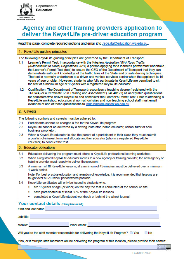 Agencies and other training providers must complete this form to apply to become a registered Keys4Life provider.