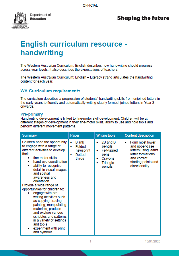 The Western Australian Curriculum: English describes how handwriting should progress across year levels. It also describes the expectations of teachers.